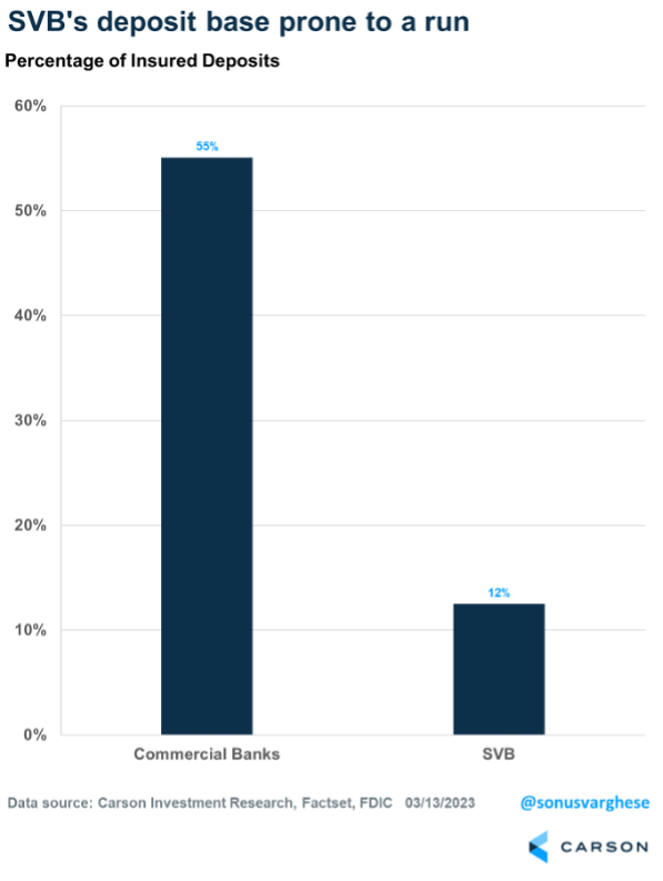 Was this the first domino to fall? Silicon Valley Bank was unlike nearly any other bank, and its portfolio set it up for distress. Bank accounts are insured up to $250,000, according to the FDIC, but most of the accounts at SVB were well above this important threshold. That meant when trouble came, investors wanted their money back fast. In fact, only 12% of its overall deposits were insured, compared with the average commercial bank’s rate of 55%.