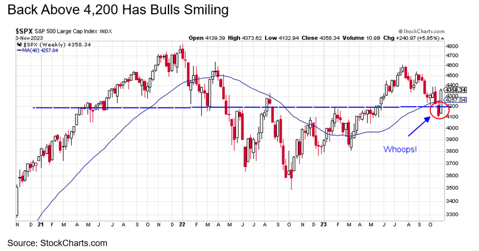 Last week, we discussed how stocks moved into a 10% correction after falling the previous three months. We also noted that this was normal, as 22 of the past 44 years saw a 10% correction, with many of those years still finishing much higher. Although many were worried, the economy remained quite strong and odds were high the Fed was done hiking rates. As a result, the S&P 500 Index gained close to 6% last week and climbed above the key 4,200 level. Rising above this significant point means recent lows are a false breakdown. To see prices back above 4,200 is quite bullish, especially considering the level of fear last week was consistent with many other major lows.